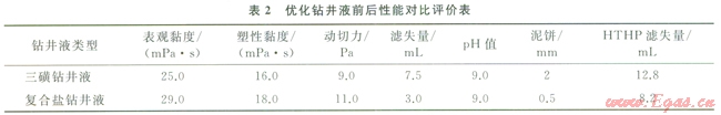 通過對“石千峰組、石盒子組”地層坍塌機理研究,從強化封堵、抑制膨脹和力學(xué)平衡三方面進行攻關(guān),研制出CQSP-X強抑制無土相復(fù)合鹽鉆井液體系。體系配方為:1.5%SFT-1+1%SMP-2+0.3%CMC(PAC)+0.5%HL60+0.2%NaOH+0.5%CMS+4%~5%QS~4+10%~l5%KCI+10%WT-l。其豐要性能與三磺鉆井液體系對比如表2所示??梢钥闯?,體系防塌能力強、潤滑防卡性能好、低剪切速率下攜屑能力強。