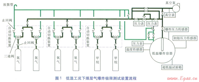 根據(jù)測試裝置流程圖,其裝置主要由低溫爆炸容器、配氣系統(tǒng)、溫控系統(tǒng)、點(diǎn)火系統(tǒng)、檢測系統(tǒng)等幾部分構(gòu)成。