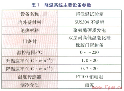 進(jìn)行低溫試驗(yàn)時,爆炸初始溫度低至-170℃,為滿足溫度要求,降溫系統(tǒng)采用超低溫試驗(yàn)箱,液氮冷卻,溫度由智能儀表自動控制。降溫系統(tǒng)主要設(shè)備參數(shù)見表1。