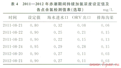3)赤潮期間,由于海水對次氯酸的消耗增大,為保證有效氯水平,應提高持續(xù)加氯濃度設定點為0.95mg/L左右。