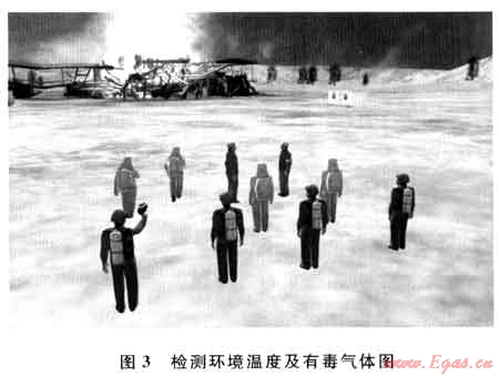 該流程是滅火搶險作業(yè)工藝流程的檢測環(huán)境溫度及有毒氣體的過程[5~7],通過仿真平臺模擬了溫度檢測及可燃氣體監(jiān)測的操作流程、同時展示了空氣呼吸器、抗高溫防火服及各種防爆工具的使用(圖3)。