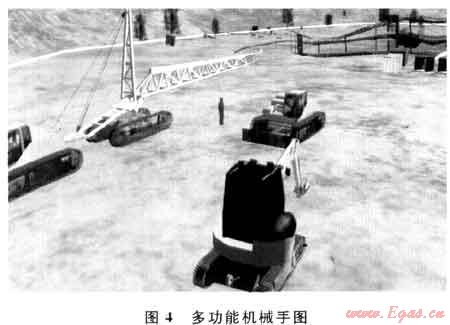 通過仿真平臺模擬展示了滅火搶險作業(yè)的核心設備——多功能機械手隅7。,充分展現(xiàn)了罩引火筒、挖掘清障、剪切清障、破碎井場水泥基礎,運送遠距離水力噴砂切割頭、吊裝單件井口裝置等功能(圖4)。