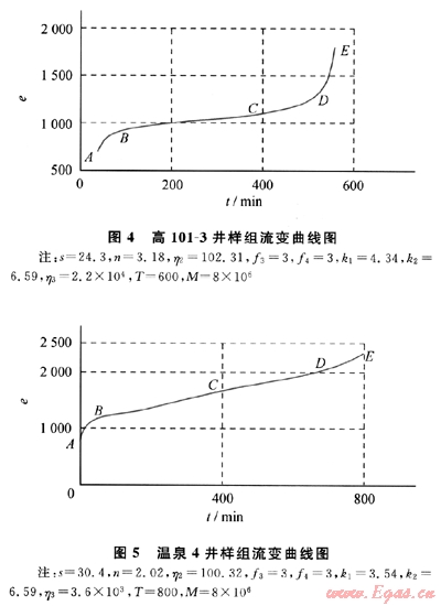 4中的AB段是油氣井在外界作用下的減速損傷階段,與承載的時間關(guān)系不大,為瞬間損傷。在第一保護區(qū)的作用下,損傷速度由大變小,損傷加速度小于0。BC段是油氣井等速損傷階段,此階段流變曲線形似一條直線,損傷速度接近常數(shù),損傷加速度為0。CD段是油氣井加速損傷階段,此階段損傷速度不斷增大,加速度也大于0。AD段是安全流變階段,其中D點是突變警戒點,從此點開始油氣井的運動開始發(fā)生了質(zhì)變,進入了危險狀態(tài)。DE屬于安全突變階段。
