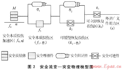安全流變 突變的物理模型由4組元件組成(如圖2)。整個系統(tǒng)框架模型分為5個層次:外界廣義作用力區(qū)、可立即恢復(fù)損傷區(qū)、可緩慢恢復(fù)損傷區(qū)、安全本質(zhì)損傷區(qū)、安全本質(zhì)損傷加速區(qū),每個層次的反應(yīng)機理和作用各不相同。事物就是在這種模型下對外界廣義作用力作出相應(yīng)的反應(yīng),最終決定事物是處于安全狀態(tài)還是危險狀態(tài)的。