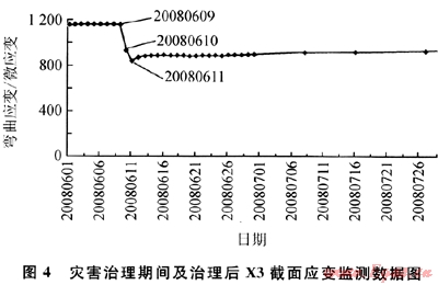 2008年4月29日及2008年5月2日的兩次強(qiáng)降雨,使該管段附近滑坡體蠕滑加劇,在雨中和雨后尤其明顯。由于管道與滑坡體之間摩擦力相互作用,隨著該滑坡體的蠕滑加劇,坡體內(nèi)的管道也發(fā)生相應(yīng)的急劇應(yīng)變變化。隨著兩次強(qiáng)降雨的逐漸遠(yuǎn)去,滑坡體的蠕滑逐漸減緩并趨于穩(wěn)定,管道的應(yīng)變變化也趨于穩(wěn)定:2008年6月9日X3截面的彎曲應(yīng)變?yōu)?154.3個微應(yīng)變,較之于2008年5月8日,僅增加了21.2個微應(yīng)變。
