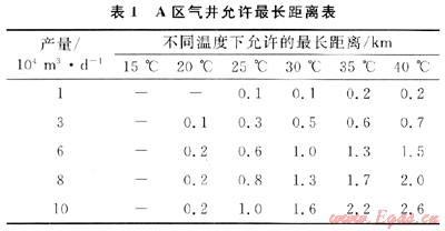 1) A區(qū)氣井的天然氣不伴熱直接進(jìn)站,不加熱直接脫水,可以取消采氣管道伴熱和站內(nèi)加熱工藝。不同產(chǎn)氣量和井口溫度允許采氣管道距離不同,其允許最長(zhǎng)距離見表1。