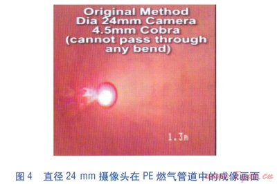 因此,傳統(tǒng)CCTV檢查系統(tǒng)用于PE燃氣管道內檢測時,只能針對含大于90。彎頭的管段或直管段。相對于較大規(guī)格的攝像頭,直徑為24mm的攝像頭亮度及可視范圍也明顯較弱。直徑分別為24、50mm的攝像頭在PE燃氣管道中的成像畫面分別見圖4、5。