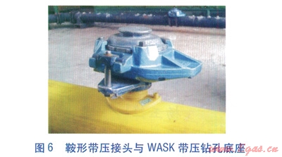 改進后的CCTV檢查系統(tǒng)借鑒了PE燃氣管道帶壓不停氣連接技術[2],采用內直徑較大的鞍形帶壓接頭(見圖6)、WASK帶壓鉆孔底座(見圖6)、與PE燃氣管道成60°的導向管(見圖7),可允許直徑為24、35、50mm的攝像頭按設定方向順利進入PE燃氣管道內。由于采用了大規(guī)格攝像頭,電纜線的直徑由4.5mm增至7.4mm,解決了攝像頭無法順利通過90°電熔彎頭的問題。