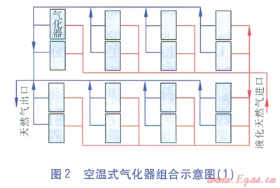 空溫式氣化器的臺數(shù)和氣化量,可跟據(jù)工程建設(shè)規(guī)模和用戶的要求綜合確定。空溫式氣化器組合示意見圖2、3。