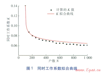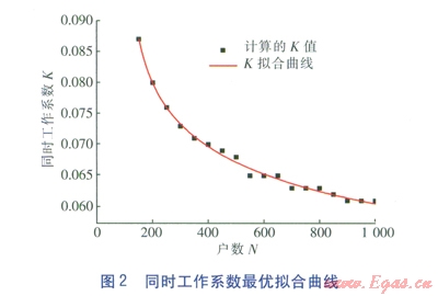 此式仍然滿足同時工作系數(shù)的一般規(guī)律,而且加冪運算使得K隨Ⅳ的變化而變化的敏感性提高。當置信區(qū)間P較小時,計算誤差對整個運算的影響逐漸減小,故而造成的波動也越來越小。針對此地區(qū)的同時工作系數(shù)在置信區(qū)間P=[0.99,1)時,將計算出來的離散數(shù)據(jù)擬合成曲線的函數(shù)關(guān)系,將表1中的數(shù)據(jù)作為依據(jù)進行擬合,得到戶數(shù)與同時工作系數(shù)的擬合結(jié)果,見圖1。