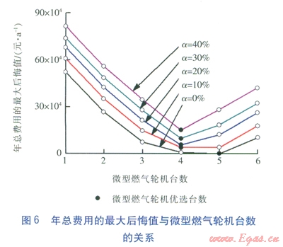 通過(guò)對(duì)5種工況下各種方案的優(yōu)化運(yùn)行結(jié)果進(jìn)行分析,得到在不同負(fù)荷不確定度下,年總費(fèi)用的最大后悔值與發(fā)電機(jī)組臺(tái)數(shù)的關(guān)系,見(jiàn)圖6。可以看出,在不考慮負(fù)荷不確定性的工況1下,最大后悔值最小的方案(最優(yōu)方案)所對(duì)應(yīng)的發(fā)電機(jī)組臺(tái)數(shù)為5臺(tái);當(dāng)考慮實(shí)際運(yùn)行中存在的負(fù)荷不確定性后(工況2~5),最優(yōu)方案的燃?xì)廨啓C(jī)臺(tái)數(shù)變?yōu)?span lang="EN-US">4臺(tái),此時(shí),配置5臺(tái)發(fā)電機(jī)組的方案其經(jīng)濟(jì)魯棒性反而較差。這說(shuō)明傳統(tǒng)的不考慮負(fù)荷不確定性的優(yōu)化配置方案在實(shí)際運(yùn)行時(shí)的經(jīng)濟(jì)魯棒性可能并非最佳,從而印證了在分布式能源系統(tǒng)優(yōu)化配置中考慮負(fù)荷不確定性的必要性。