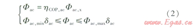 考慮機(jī)組輸出功率的上下限,并假定機(jī)組性能系數(shù)(hCOP,ac)保持不變,采用如下模型: