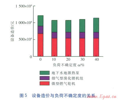 5種工況下相應(yīng)優(yōu)化配置方案的設(shè)備造價(jià)情況見(jiàn)圖5??梢钥闯?,發(fā)電機(jī)組的造價(jià)在系統(tǒng)初投資中占較大比例;由于分布式能源系統(tǒng)的優(yōu)化配置在考慮負(fù)荷不確定性后,發(fā)電機(jī)組的臺(tái)數(shù)由5臺(tái)減為4臺(tái),因此,系統(tǒng)的初投資相對(duì)于傳統(tǒng)的不考慮負(fù)荷不確定性的優(yōu)化配置方案而言有所減少;隨著負(fù)荷不確定度的增加,地下水地源熱泵機(jī)組的造價(jià)因考慮極限工況而增加,使得總的初投資逐漸增加。