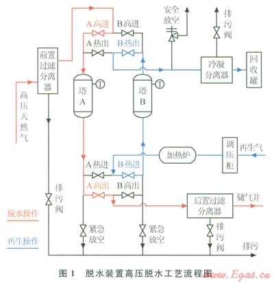 脫水操作流程:被壓縮后的高壓天然氣經(jīng)前置過濾分離器分離可能存在的游離水、油和雜質(zhì),然后經(jīng)A高進(jìn)閥從塔A頂部進(jìn)入,與塔內(nèi)分子篩充分接觸,分子篩吸附高壓天然氣所含的水和部分烴得到干燥的天然氣,干燥后的天然氣從塔A底部排出,經(jīng)A高出閥進(jìn)入后置過濾分離器分離后進(jìn)入高壓儲(chǔ)氣容器。后置過濾分離器主要濾掉氣流中攜帶的分子篩粉末,以免堵塞后續(xù)設(shè)備。
