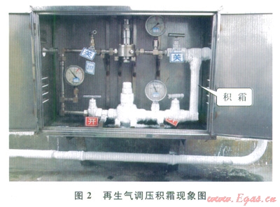 由脫水裝置工藝流程知,再生氣從塔A頂部排出時(shí)攜帶了大量的熱量直接進(jìn)入冷凝分離器,存在如下問題:①冷凝分離器進(jìn)口溫度較高,不利于氣液分離,影響分離效果;②再生氣的熱量大量浪費(fèi),沒能得到再次利用,同時(shí)也提高了回收罐的溫度。再生氣調(diào)壓后存在節(jié)流降壓積霜現(xiàn)象(圖2),導(dǎo)致加熱爐的進(jìn)氣溫度很低,而脫水塔頂部出口溫度較高,致使冷凝分離器進(jìn)口溫度較高,不利于CNG分離,由此提出了再生氣余熱利用節(jié)能技術(shù),即利用再生氣的余熱預(yù)熱調(diào)壓后的低溫再生氣,同時(shí)利用調(diào)壓閥節(jié)流降溫后的冷量冷卻脫水后的高溫再生氣,兩者的能量(熱量與冷量)互補(bǔ)利用,實(shí)現(xiàn)節(jié)能降耗的目的。節(jié)能技術(shù)有如下效果:①提高再生氣進(jìn)入加熱爐的進(jìn)氣溫度,降低加熱爐的電耗;②減少再生氣加熱時(shí)間,減少再生氣的用量;③降低冷凝分離器進(jìn)口溫度,提高分離效果。