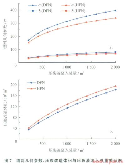 DFN模型和HFN模型計(jì)算所得縫網(wǎng)最大縫高分別為27.9m27.2m,不隨壓裂液泵入總量的變化而變化。在其他條件相同的情況下,隨著壓裂液泵入總量的增大,ab逐漸增大,壓裂改造體積逐漸增大;對(duì)于DFN模型,al71m增加至395mb34m增大至79m,壓裂改造體積由34×104m3增大至183×104m3;對(duì)于HFN模型,以由153m增加至340m,b31m增大至68m,壓裂改造體積由40×104m3增大至l97×l04m3;在泵入相同體積壓裂液的情況下,利用DFN模型計(jì)算的縫網(wǎng)幾何參數(shù)比HFN模型計(jì)算值大(7-a);而利用DFN模型計(jì)算的壓裂改造體積比HFN模型計(jì)算值小(7-b)