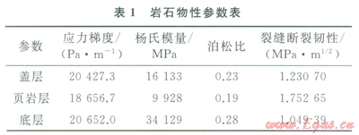 A井垂深2380m,水平井段長(zhǎng)l828m,目標(biāo)頁(yè)巖層在23702397m,層厚27m,基質(zhì)滲透率為0.002mD,各層巖石物性參數(shù)如表1所示;本井共進(jìn)表1巖石物性參數(shù)表行了七級(jí)清水壓裂,每一級(jí)有5簇射孔段,每一簇含8個(gè)射孔孔眼;選擇100目石英砂作為支撐劑,假設(shè)支撐劑在所有裂縫中均勻分布,沉降速率為1.27mmmin。兩個(gè)模型均假設(shè)縫網(wǎng)由兩簇分別垂直于最大、最小水平主應(yīng)力的垂直縫組成,不含水平縫。