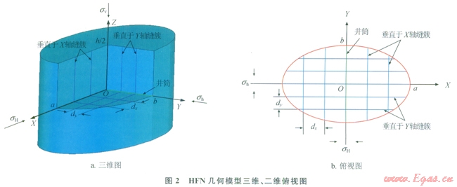 HFN模型基本假設(shè)如下:壓裂改造體積為沿井軸對(duì)稱2a×2b×h的橢柱體,由直角坐標(biāo)系XYZ表征,X軸平行于sH方向,Y軸平行于sh方向,Z軸平行于sv方向;②將縫網(wǎng)等效成兩簇分別垂直于X軸、Y軸的縫寬、縫高均恒定的裂縫,縫間距分別為dx、dy考慮流體與裂縫以及裂縫之間的相瓦作用;④不考慮壓裂液濾失?;谝陨霞僭O(shè),做出HFN模型的幾何模型示意圖(2)。