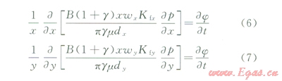 由于縫網(wǎng)內(nèi)裂縫寬度很小,因此可以假設(shè)流體在裂縫中的流動(dòng)遵循流體滲流方程,則橢圓滲流方程為: