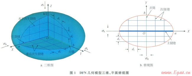 DFN模型基本假設(shè)如下:壓裂改造體積為2a×2b×h的橢球體,由直角坐標(biāo)系XYZ表征,X軸平行于最大水平主應(yīng)力(sH)方向,Y軸平行于最小水平主應(yīng)力(sh)方向,Z軸平行于垂向應(yīng)力(sv)方向;包含一條主裂縫及多條次生裂縫,主裂縫垂直于sh方向,在X-Z平面內(nèi)擴(kuò)展,次生裂縫分別垂直于XY、Z軸,縫間距分別為dxdy、dz;考慮縫間十?dāng)_及壓裂液濾失;④地層及流體不可壓縮?;谝陨霞僭O(shè),作出DFN模型幾何模型的示意圖(1)。