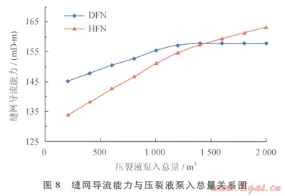 由圖8可知,隨著壓裂液泵入總量的增大,縫網(wǎng)導(dǎo)流能力增大;對(duì)于DFN模型,縫網(wǎng)導(dǎo)流能力從l45mD·m增大至l58mD·m,且當(dāng)壓裂液泵入總量超過(guò)l200m3后,縫網(wǎng)導(dǎo)流能力基本保持不變;對(duì)于HFN模型,縫網(wǎng)導(dǎo)流能力從l34mD·m增大至l63mD·m。當(dāng)壓裂液泵入總量低于l400m3時(shí),DFN模型計(jì)算得到的縫網(wǎng)導(dǎo)流能力偏大;當(dāng)壓裂液泵入總量高于1400m3時(shí),HFN模型計(jì)算值偏大。