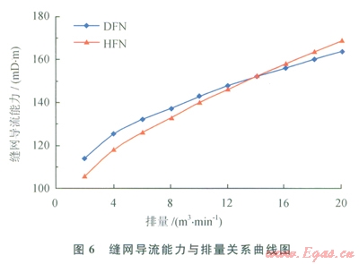 由圖6可知,隨著排量的增大,縫網(wǎng)導(dǎo)流能力增大;對(duì)于DFN模型,縫網(wǎng)導(dǎo)流能力從ll4mD·m增大至l63mD·m;對(duì)于HFN模型,縫網(wǎng)導(dǎo)流能力從106mD·m增大至169mD·m。當(dāng)流量低于l4m3min時(shí),DFN模型計(jì)算的縫網(wǎng)導(dǎo)流能力偏大;當(dāng)流量高于l4m3min時(shí),HFN模型計(jì)算值偏大。