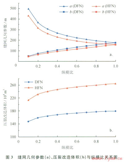 DFN模型和HFN模型計(jì)算所得縫網(wǎng)最大縫高分別為27.9m27.2m,不隨縱橫比的變化而變化。在相同壓裂施工條件下,隨著縱橫比的增大,a逐漸降低,b逐漸增大,壓裂改造體積逐漸增大;對(duì)于DFN模型,a500m降低至l76m,b50m增大至l76m,壓裂改造體積由l47×104m3增大至179×l04m3;對(duì)于HFN模型,a435m降低至158mb43.5m增大至158m,壓裂改造體積由214×104m3增大至264×104m3。在相同縱橫比下,利用DFN模型計(jì)算的縫網(wǎng)幾何參數(shù)比HFN計(jì)算值大(3-a);而利用DFN模型計(jì)算的壓裂改造體積比HFN模型計(jì)算值小(3-b)。