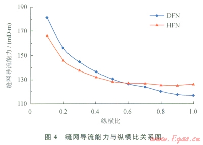 縫網(wǎng)導(dǎo)流能力為縫網(wǎng)平均縫寬與縫網(wǎng)平均滲透率之積,反映了流體在縫網(wǎng)中的流動(dòng)能力。由圖4可知:隨著縱橫比的增大,縫網(wǎng)導(dǎo)流能力降低;對(duì)于DFN模型,縫網(wǎng)導(dǎo)流能力從18lmD·m降低至117mD·m;對(duì)于HFN模型,縫網(wǎng)導(dǎo)流能力從l67mD·m降低至126mD·m。當(dāng)縱橫比小于0.6時(shí),DFN模型計(jì)算得到的縫網(wǎng)導(dǎo)流能力偏大;當(dāng)縱橫比大于0.6時(shí),HFN模型計(jì)算值偏大。