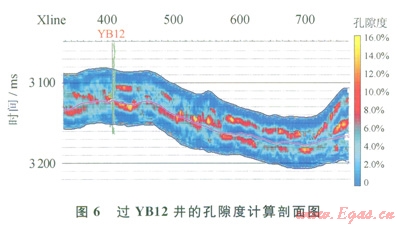 目前,各種地震疊前數(shù)據(jù)反演的軟件[16]。和疊前反演的方法[17-22]都比較成熟,通過(guò)較好的疊前三維地震資料可以較準(zhǔn)確地反演出縱波速度、橫波速度和體積密度等彈性參數(shù)。圖4為過(guò)YBl2井的原始疊后地震剖面。儲(chǔ)層位于圖中標(biāo)注的層位為下三疊統(tǒng)飛仙關(guān)組一段上二疊統(tǒng)長(zhǎng)興組之間[23-25]。從剖面上可以看出地層的橫向變化大,分辨率低,信噪比較低等特征。圖5-a、b和c分別為應(yīng)用疊前同時(shí)反演方法獲得的縱波速度、橫波速度和體積密度反演剖面。從圖中可以看出,井旁道反演的數(shù)據(jù)與測(cè)井曲線的相關(guān)性較好。從反演數(shù)據(jù)剖面中可以發(fā)現(xiàn),疊前彈性參數(shù)反演獲得橫波速度數(shù)據(jù)和密度數(shù)據(jù)剖面的分辨率高于縱波速度數(shù)據(jù)剖面上的分辨率,為縱向高分辨率的孔隙度計(jì)算提供了條件。圖6為應(yīng)用本方法計(jì)算的過(guò)YB12井的孔隙度剖面。從圖6中還可以看出,計(jì)算孔隙度與實(shí)測(cè)孔隙度之間的相關(guān)性非常高,計(jì)算的孔隙度數(shù)據(jù)的分布范圍也與測(cè)井?dāng)?shù)據(jù)相當(dāng)吻合,并且從孔隙度剖面上能夠?qū)⒃搩?chǔ)層段分為上下兩套孔隙度發(fā)育的儲(chǔ)層,孔隙度計(jì)算剖面上展布的橫向規(guī)律與地質(zhì)、鉆井認(rèn)識(shí)規(guī)律保持一致。因此,從孔隙度計(jì)算的結(jié)果可以看出,筆者提議的孔隙度計(jì)算方法在碳酸鹽巖儲(chǔ)層孔隙度計(jì)算中效果比較明顯,能夠較好地提高孔隙度計(jì)算的精確度。