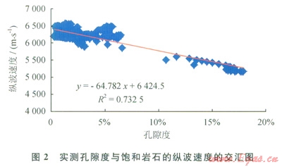 為了驗(yàn)證提議方法的正確性,將提議方法用于YB地區(qū)。該地區(qū)儲(chǔ)層屬于碳酸鹽巖礁灘相儲(chǔ)層,儲(chǔ)層埋藏深,總體上孔隙度較小,圍巖與儲(chǔ)層的縱波速度差異小,鉆井和地質(zhì)資料表明儲(chǔ)層分為上下兩套儲(chǔ)層。工區(qū)中1口鉆井的測(cè)井曲線如圖l所示。測(cè)井曲線從左到右,依次為自然伽馬、縱波速度、橫波速度、體積密度和孔隙度曲線。圖2為實(shí)測(cè)孔隙度與飽和巖石縱波速度交匯圖。交匯圖的線性回歸分析表明,孔隙度與飽和巖石的縱波速度的相關(guān)值平方約為0.73。圖3為孔隙度與飽和巖石的有效壓縮系數(shù)交匯圖。實(shí)測(cè)孔隙度與應(yīng)用巖石的有效壓縮系數(shù)計(jì)算的孔隙度相關(guān)值平方達(dá)到0.85,表明孔隙度與巖石的有效壓縮系數(shù)之間有著良好的線性關(guān)系。與僅僅利用縱波速度計(jì)算孔隙度結(jié)果相比較,利用飽和巖石的有效壓縮系數(shù)計(jì)算的孔隙度精確度提高約12%。