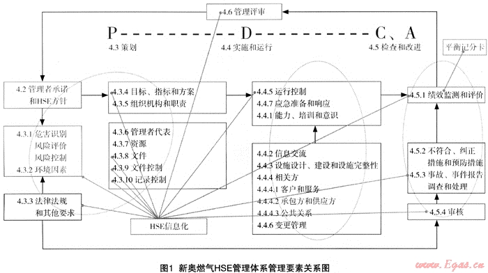 新奧燃?xì)鈪⒖剂藝?guó)際、國(guó)內(nèi)范圍內(nèi)有關(guān)的HSE標(biāo)準(zhǔn),建立并發(fā)布了新奧燃?xì)釮SE管理體系企業(yè)標(biāo)準(zhǔn)(Q/XARQ01.1-2007),覆蓋SY/T6276—1997《石油天然氣工業(yè)健康、安全與環(huán)境管理體系規(guī)范》所有要求。并要求旗下所有企業(yè)按標(biāo)準(zhǔn)要求建立并實(shí)施HSE管理體系并形成三級(jí)文件管理體系。新奧燃?xì)釮SE管理體系企業(yè)標(biāo)準(zhǔn)各要素之間的關(guān)系如圖1所示。