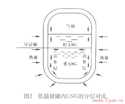 渦旋主要是由于在向盛有LNG的低溫儲(chǔ)罐中充注新的LNG液體或者LNG中氮蒸發(fā)而使儲(chǔ)罐內(nèi)的液體發(fā)生分層。分層液體在儲(chǔ)罐周邊漏熱的作用下,形成各自獨(dú)立的自然對(duì)流循環(huán),進(jìn)而使各層液體的密度不斷發(fā)生變化,見圖2。當(dāng)相鄰兩層液體的密度近似相等時(shí),兩個(gè)液層就會(huì)發(fā)生強(qiáng)烈混合,下層積聚的熱量突然釋放出來,同時(shí)伴隨著LNG表面蒸發(fā)率的驟增,幾乎可達(dá)到正常情況下蒸發(fā)率的250倍。蒸發(fā)產(chǎn)生的大量氣體,引起儲(chǔ)罐內(nèi)壓力突然增大,導(dǎo)致大量天然氣排空,造成嚴(yán)重浪費(fèi),甚至可能毀壞儲(chǔ)罐及工藝系統(tǒng),引起爆炸或火災(zāi),嚴(yán)重威脅人員和財(cái)產(chǎn)安全。