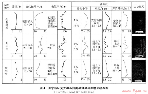 川東地區(qū)黃龍組碳酸鹽巖受到長期的大氣水風(fēng)化、剝蝕和溶蝕作用改造,由孔隙、溶洞和裂縫組成的儲(chǔ)集空間很發(fā)育,但也非常復(fù)雜[4~5],按孔、洞、縫的組合方式及其所占比例的差異性可將儲(chǔ)層劃分為不同孔、滲特征的3種類型,各類型儲(chǔ)層的常規(guī)測(cè)井響應(yīng)特征有明顯差異[6~8],具有不同的測(cè)井響應(yīng)模型。