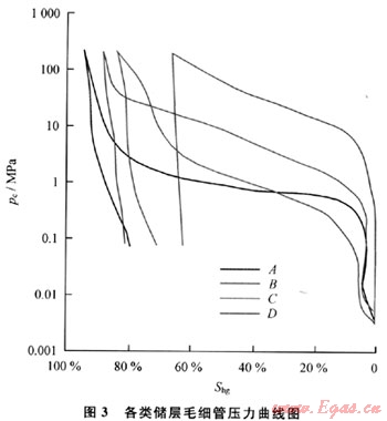 Ⅰ型:孔隙類型主要為粒間溶孔、晶間溶孔以及裂縫組合,巖石類型主要為溶孔狀顆粒-晶粒白云巖,毛細(xì)管壓力曲線為分選好的單峰較粗歪度,呈很平緩的右凹平臺(tái)狀,平臺(tái)較長(圖3中A曲線)。排驅(qū)壓力小于0.1MPa,中值壓力小于1.0MPa,孔隙度大于或等于12%,滲透率大于或等于1mD,為該區(qū)最好的孔隙結(jié)構(gòu)類型。