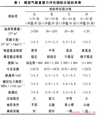 評(píng)價(jià)指標(biāo)反映了評(píng)價(jià)對(duì)象的本質(zhì)屬性。煤層氣資源的本質(zhì)屬性比較抽象,其勘查潛力又涉及資源屬性、可采性、開發(fā)利用條件等諸多方面,各評(píng)價(jià)指標(biāo)在用于表述勘查潛力的指標(biāo)體系中所處的層次不同,且同一層次指標(biāo)的重要性有異。因此,只能用有限的指標(biāo)(定性與定量指標(biāo)結(jié)合)盡可能從本質(zhì)上刻畫或表述煤層氣資源勘查潛力這一對(duì)象的主體、本質(zhì)部分。