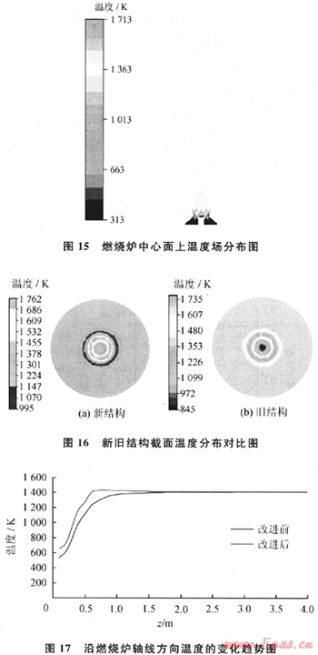 圖15為爐內主射流溫升速度示意圖,圖16為新舊結構截面溫度分布對比圖,圖中顯示新結構爐內溫度分布非常均勻,基本維持在1400K,與原結構下的溫度場相比,射流外圍邊界上因為外環(huán)入口酸氣的通入溫度有所降低。但此區(qū)域內氣體受回流區(qū)及氣體對流傳熱影響,溫度在很短距離內即可達到爐內平均溫度。圖17為沿燃燒爐軸線方向溫度的變化趨勢圖。由圖17可以看出,新結構下射流中心區(qū)域溫升明顯加快,在很短的距離內即可達到1400K。