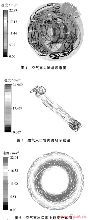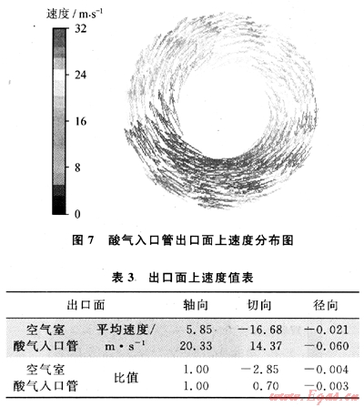空氣室及酸氣入口管內流場如圖4、5所示。圖6、圖7為空氣室及酸氣入口管出口面上的速度分布圖。表3所示為現役旋流裝置下空氣室和酸氣入口管出口面上的速度分量。流場計算完成后,將空氣室和酸氣入口管出口面上的速度參數作為燃燒爐爐體的空氣與酸氣入口條件對爐內燃燒場進行數值模擬。