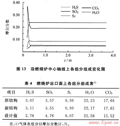 圖13為沿燃燒爐軸線方向各組分組成變化圖。由硫生成曲線來看,單質硫在燃燒器內增量最快,之后呈非常緩慢的增長趨勢。表4為改進前后燃燒爐出口面上各組分的組成表,由表4可知,出口處各組分含量與燃燒爐實際運行值較為吻合,而與原結構相比,新結構出口面上S2的摩爾分數提高了0.03%,說明采用外環(huán)酸氣入口提高了爐內氣體混合效果并進而提高了燃燒爐的總硫轉化率。