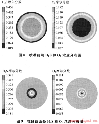 圖8、9分別為假定爐內沒有反應發(fā)生時噴嘴前端(燃燒器直徑最小處)及燃燒器斜錐段xy截面上的組分分布圖。