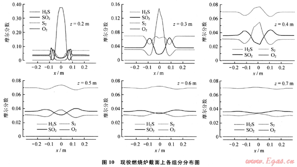 圖10為啟動爐內燃燒反應時在不同z值下沿刪截面中心軸線上各組分的分布情況。