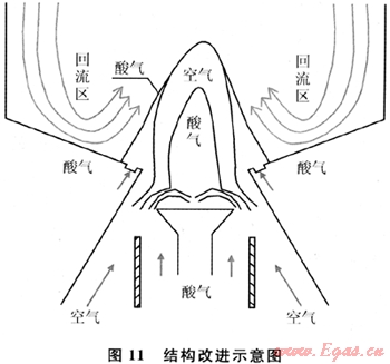 主射流呈一種空氣包絡酸氣的分布形態(tài),此分布將導致O2消耗完畢后,射流中心區(qū)域內H2S過量,射流外圍處S02過量。H2S與S02的混合將主要取決于主射流內外氣體的不斷擴散完成,此混合過程相對較慢,對單質硫的生成來講是不利的。為此,筆者提出了增設外環(huán)酸氣入口的結構改進措施(圖11),外環(huán)酸氣入口貼近空氣室外壁面,入口方向與預混合段平行。通過此方法進行改進,可對射流中心處過量的H2S分流,并將其直接通入到射流外圍的S02濃度最大處。