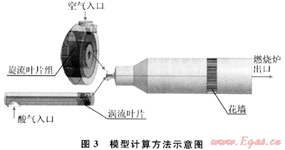 隨著我國高含硫氣田的深入開發(fā),如何提高天然氣凈化裝置技術水平及減少裝置能耗是當前面臨的一個較大的技術挑戰(zhàn)。燃燒爐是克勞斯類硫磺回收及尾氣處理工藝中最關鍵的制硫設備,爐內單質硫生成量可占整個工藝的70%左右。在實際運行中,燃燒爐起著生成單質硫、提供反應熱及消除雜質等重要作用。要實現以上功能就要求燃燒爐必須具備強力燃燒的特點。燃燒器是燃燒爐內的核心部件。多采用高旋流裝置來實現爐內氣體的強力燃燒,如L D Duiker燃燒器及ACE0燃燒器[1~4]。為提高燃燒爐裝置技術水平,使其更好地適應天然氣工業(yè)的快速發(fā)展,基于現役燃燒爐結構建立了燃燒爐的三維實體模型,依據燃燒爐實際入口參數對爐內燃燒場進行了數值模擬。重點考察了現役旋流裝置對爐內氣體混合效果及組分分布的影響,并在此基礎上提出了相應的結構改進措施。