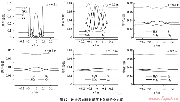 圖12為各組分在噴嘴前端沿xy截面中心軸線上的分布情況。對比圖10可知,H2S由原來的單駝峰式分布變?yōu)槎喾迨椒植肌Mㄟ^外環(huán)酸氣分流,提高了射流外圍處H2S的含量,外環(huán)酸氣直接通入到原S02濃度最大處,使此處的單質硫生成量增多。由各組分濃度變化來看,H2S和S02的二次混合過程由原來主射流旋流擴散混合轉變?yōu)橹苯釉谏淞魍鈬吔鐚犹幓旌?。由圖12可知,爐內組分在z為0.6m處即可基本達到平衡,說明采用外環(huán)酸氣入口將H2S直接通入S02濃度最大處,提高了H2S與S02的混合效果。
