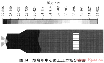 圖14為新結構下燃燒爐內的壓力分布圖。從圖14可以看出,壓降損失最大的區(qū)域為噴嘴至火焰區(qū)的收斂噴口處,火焰區(qū)內處于負壓,出口處壓強約128kPa,入口處壓強最高為136kPa。爐內總壓降為8kPa,與忠縣天然氣凈化廠內燃燒爐設計壓降11kPa相比,減小了3kPa。因此新結構在滿足現有硫回收功能的同時,能夠減小設備壓降,提高總硫回收率。