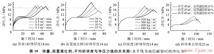 從圖10可以得出排量和平均砂濃度沒有前置液比例對縫內(nèi)凈壓力上漲的控制力度大,且25m垂直厚度的厚儲層凈壓力漲幅遠(yuǎn)低于14m的薄儲層凈壓力的漲幅。按照凈壓力預(yù)測結(jié)果,以增加主裂縫縫長和控制次生裂縫產(chǎn)生為出發(fā)點(diǎn),蘇5、桃7區(qū)塊水平井分段壓裂參數(shù)優(yōu)化范圍如下:排量3.5~4.0m3/min、薄砂體前置液比例45%~50%,厚砂體前置液比例43%~45%,平均砂濃度360~400kg/m3。