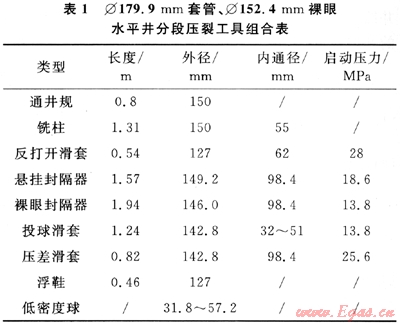 裸眼水平井分段壓裂需要的主要工具類型和參數(shù)見表1。按國際標(biāo)準(zhǔn),投球滑套內(nèi)通徑采用6.3mm梯度,分段級數(shù)小于等于6級,采用3.175mm梯度,分段級數(shù)可達(dá)到10級[1]