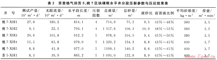 目前,蘇里格氣田蘇5、桃7區(qū)水平井分段壓裂共施工7口井,施工成功率100%,獲得平均測試產(chǎn)量14.8×104m3/d,平均無阻流量75.6×104m3/d,最高測試產(chǎn)量27.8×104m3/d,最高無阻力量160.2×104m3/d,具體設(shè)計及施工參數(shù)和壓后產(chǎn)量如表2所示。壓后效果證明筆者所建立的方法有效,結(jié)論正確,應(yīng)用效果良好。