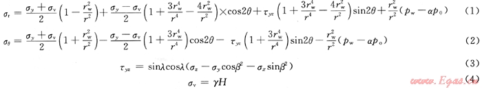 式中σr為徑向應(yīng)力,MPa;σy、σx分別為水平最大主應(yīng)力和最小主應(yīng)力,MPa;r為徑向距離,m;rw為井眼半徑,m;θ為井眼圓周上一點(diǎn)與水平面的夾角,(°);τyz為垂直于井筒yz平面的剪應(yīng)力,MPa;pw為井眼內(nèi)壓力,MPa;po為孔隙壓力,MPa;α為泊松比;γ為平均容重,kN/m3;H為地層深度,m;λ為井筒與垂直方向的夾角,(°);β為井筒與水平最大主應(yīng)力的夾角,(°)。