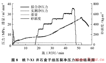 在待壓裂水平井壓裂參數(shù)設(shè)計前,先采用 FracproPT10.7軟件對鄰井已施工的同層位井壓裂曲線進(jìn)行精確凈壓力擬合,以桃7-X1井壓裂施工曲線擬合為例,擬合結(jié)果如圖8所示,獲取區(qū)域地應(yīng)力參數(shù)和巖石力學(xué)參數(shù):泊松比為0.22,彈性模量為1.2×104MPa,產(chǎn)層閉合壓力梯度為0.0126MPa/m,產(chǎn)層閉合壓力為41.4MPa,泥巖閉合壓力為46.92MPa,產(chǎn)、隔層應(yīng)力差為5.5MPa,區(qū)域破裂壓力梯度為0.018MPa/m,區(qū)域地層破裂壓力為59.0MPa。