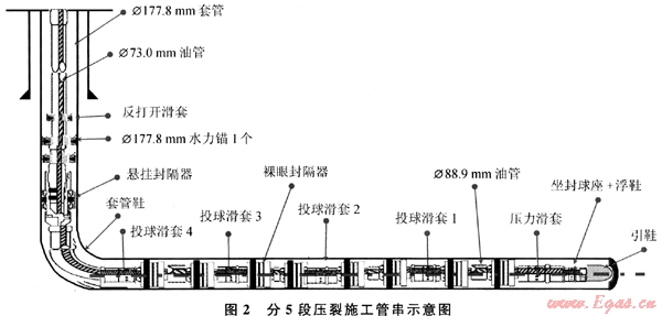 為了讓裂縫在壓裂段能集中起裂,蘇里格氣田多數(shù)以雙封隔器進(jìn)行單段壓裂,例如分5段使用8個裸眼封隔器,其壓裂施工管柱結(jié)構(gòu)如圖2所示,反打開滑套可在壓裂施工前打開,施工時以便監(jiān)測井底壓力。